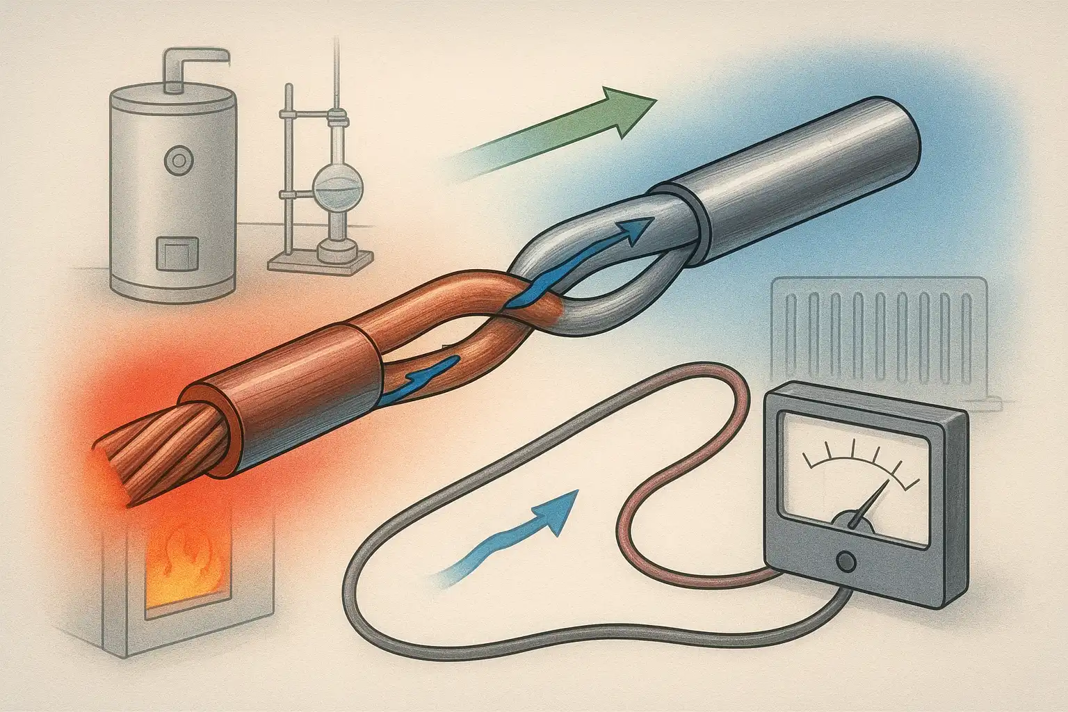 اثر سیبک یکی از اصول پایهای عملکرد ترموکوپلها است که بر اساس ایجاد اختلاف ولتاژ بین دو فلز متفاوت در دماهای مختلف کار میکند. این پدیده با حرکت حاملهای بار از نقطه گرم به سرد باعث تولید ولتاژ میشود که مقدار آن به اختلاف دما و ضریب سیبک فلزات وابسته است. ضریب سیبک معیاری برای سنجش توانایی فلز در تبدیل گرما به برق است و انتخاب فلزات مناسب، دقت اندازهگیری ترموکوپل را تعیین میکند. ترموکوپلها در انواع مختلف (مانند نوع K، J، T و S/R) در صنایع و تجهیزات خانگی مانند آبگرمکن، بخاری و اجاق گاز کاربرد دارند و نقش مهمی در کنترل دما و ایمنی دستگاهها ایفا میکنند. مزیتهای آنها شامل مقاومت بالا، سرعت پاسخدهی سریع و هزینه کم است، اما دقت پایینتر نسبت به حسگرهای پیشرفته و کاهش حساسیت با گذر زمان از معایب آنهاست. اثر سیبک علاوه بر اندازهگیری دما، در فناوریهای ترموالکتریک برای بازیابی انرژی حرارتی نیز کاربرد دارد. پژوهشهای جدید به دنبال بهبود ضریب سیبک و افزایش دقت ترموکوپلها هستند تا با اختلاف دمای کمتر، ولتاژ بیشتری تولید و عملکرد دستگاهها بهینه شود. دانستن این اصل برای کاربران وسایل گرمایشی و سرمایشی جهت درک بهتر عملکرد و عیبیابی تجهیزات حیاتی است.